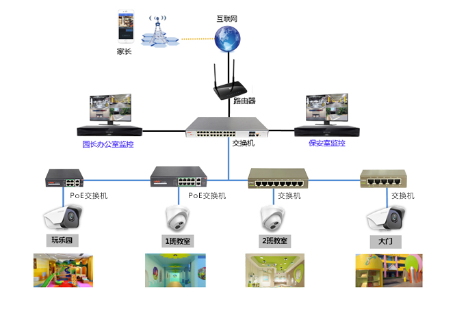 2、帶寬配置:接入層采用百兆下聯(lián)、千兆上聯(lián)POE供電交換機(jī),搭建最高配置帶寬鏈路;
