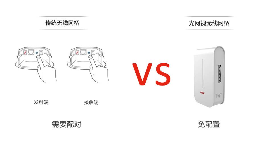 傳統(tǒng)的無線網(wǎng)橋多為自由配對,光網(wǎng)視ONV-CPE300P網(wǎng)橋出廠設(shè)置免配對,支持一鍵快速數(shù)碼配對,無須多余配置,更加輕松高效。
