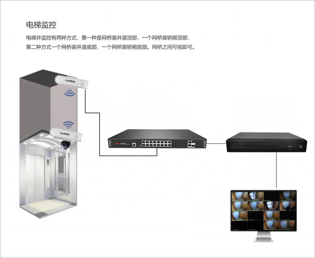 為了保證最佳的無線監(jiān)控效果,無線網(wǎng)橋具有多種組網(wǎng)模式,可根據(jù)環(huán)境選擇點(diǎn)對點(diǎn)、點(diǎn)對多點(diǎn)、中繼等傳輸模式、電梯監(jiān)控連接方式。