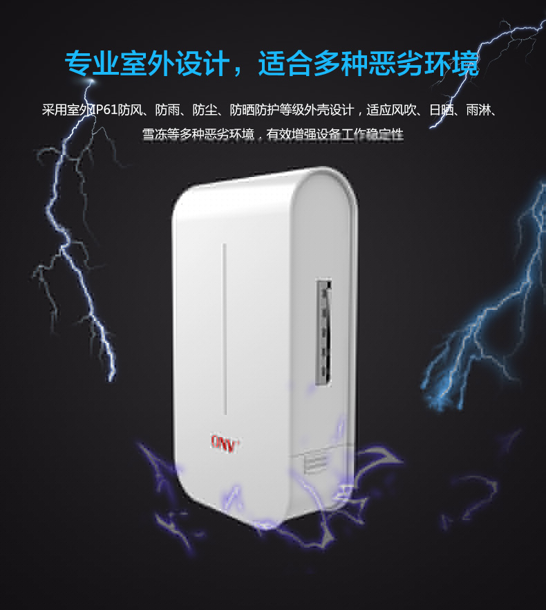 多用于室外的無線網(wǎng)橋,應(yīng)該具備適應(yīng)各種雷電、雨雪等各種惡劣環(huán)境的條件,ONV-CPE300P網(wǎng)橋采用工業(yè)級(jí)一體化成型外殼,具備IP61級(jí)防塵、防水,適應(yīng)風(fēng)吹 、日曬 、雨淋 、雪凍等各種惡劣環(huán)境, 即使是極端的高低溫 (-40°C~70°C) 環(huán)境,也能正常穩(wěn)定工作。