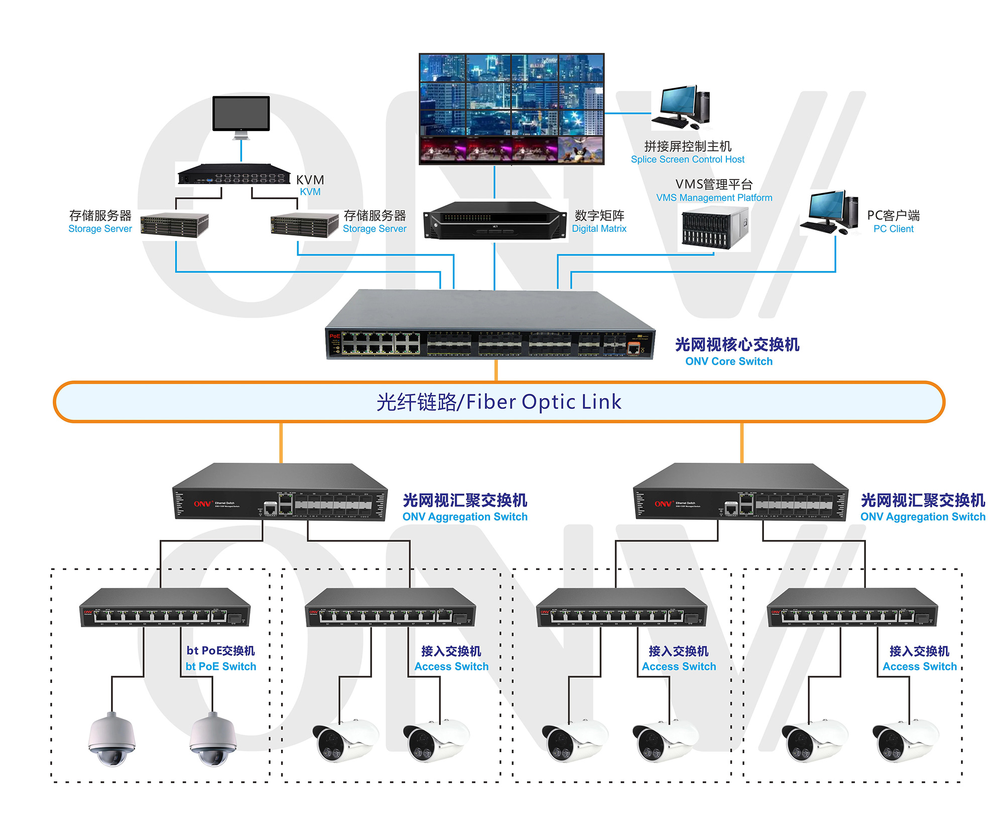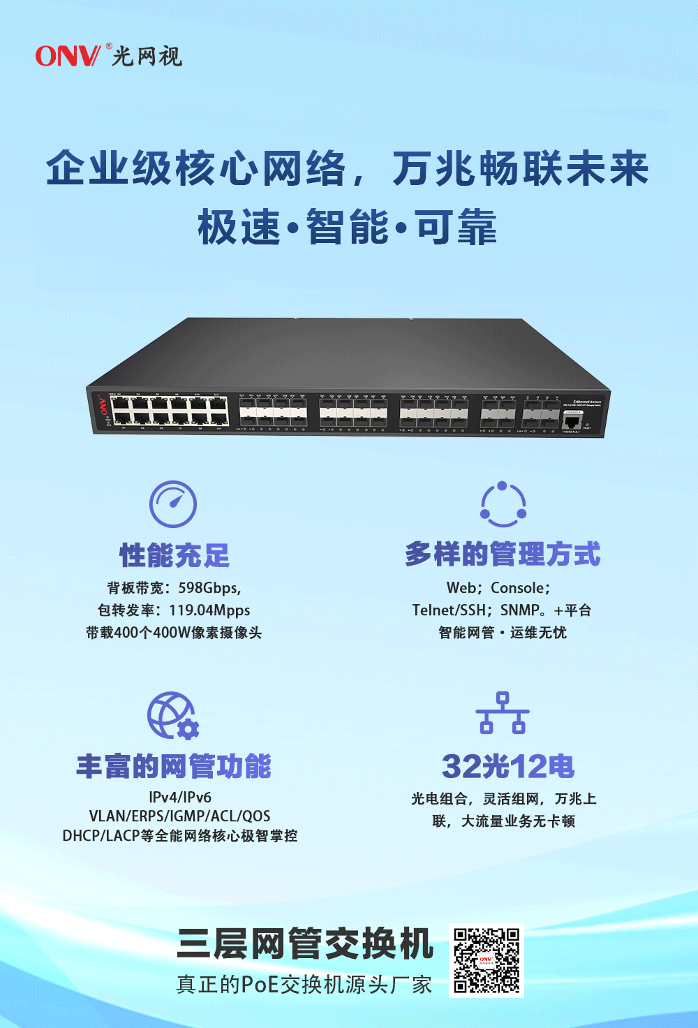 面對上述挑戰(zhàn),項目選用了光網(wǎng)視(ONV)的工程級三層核心以太網(wǎng)交換機作為網(wǎng)絡傳輸?shù)暮诵幕?。該方案完美契合了高空拋物監(jiān)控對網(wǎng)絡基礎設施的嚴苛要求: